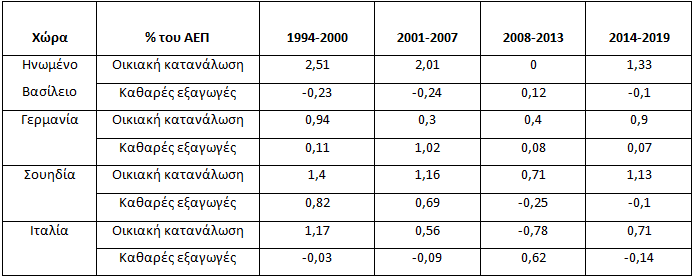 Πηγή: Επεξεργασμένα στοιχεία από την AMECO*Η συμβολή της κατανάλωσης ή των καθαρών εξαγωγών υπολογίζεται μέσω του γινομένου του ετήσιου ρυθμού μεγέθυνσης της κατανάλωσης ή των καθαρών εξαγωγών επί το μερίδιο τους στο ΑΕΠ κατά την προηγούμενη περίοδο (t-1). Οι τιμές που εντοπίζονται στον πίνακα αποτελούν μέσους όρους για κάθε περίοδο (1994-2000, 2001-2007, 2008-2013, 2014-2019).