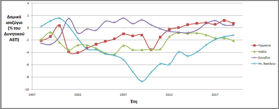 Στη Σουηδία, όπου ο προσανατολισμός της μεγέθυνσης είναι ισορροπημένος ανάμεσα στην οικιακή κατανάλωση και τις καθαρές εξαγωγές στην περίοδο 2001-2007, θα ήταν εύλογο να εντοπιστούν τα χαρακτηριστικά της «περιορισμένης ευχέρειας» στο θεσμικό πλαίσιο της δημοσιονομικής πολιτικής. Πράγματι, η Σουηδία είναι η μόνη από τις τέσσερεις χώρες στην περίοδο αυτή που υιοθετεί στόχευση διαρθρωτικού πλεονάσματος στο μεσοπρόθεσμο διάστημα, ενώ ταυτόχρονα προβλέπεται ένα περιθώριο στο δεσμευτικό όριο των συνολικών δαπανών20. Μάλιστα, παρά την απουσία νομικής δέσμευσης, οι αρχές συμμορφώνονται ως προς το πλεόνασμα (Διάγραμμα 1) και το περιθώριο στις δαπάνες. Έτσι, η Σουηδία έχει τη δυνατότητα να προβεί σε αντικυκλικές πολιτικές κατά την ύφεση χωρίς αυτό να οδηγήσει σε σημαντική επιδείνωση του ισοζυγίου. Όσον αφορά στους διαδικασιακούς κανόνες, η περιγραφική ανάλυση αναδεικνύει την ύπαρξη ικανοποιητικών top-down διευθετήσεων. Ακόμη, η Σουηδία, αντίθετα από τις υπόλοιπες υπό εξέταση χώρες, υιοθετεί Δημοσιονομικό Συμβούλιο ήδη από το 2007, δηλαδή πριν από την ύφεση. Το Σουηδικό Δημοσιονομικό Συμβούλιο, παρότι έχει αντιμετωπίσει ζητήματα ανεξαρτησίας, για παράδειγμα μέσω απειλών για τη χρηματοδότησή του, απολαμβάνει την εμπιστοσύνη της εγχώριας πολιτικής οικονομίας και συνεργάζεται αποτελεσματικά με τους ήδη υπάρχοντες θεσμούς και ινστιτούτα21. Η συσχέτιση φαίνεται να επιβεβαιώνεται για την περίοδο 2001-2007, όχι όμως και για τα χρόνια μετά την ύφεση. Παρότι η μεγέθυνση προσανατολίζεται αποκλειστικά στην οικιακή κατανάλωση την περίοδο 2014-2019, το δημοσιονομικό πλαίσιο δε χαλαρώνει, αλλά ενισχύεται περαιτέρω, για παράδειγμα μέσω της νομικής κατοχύρωσης του στόχου του πλεονάσματος και του περιθωρίου στις δαπάνες.