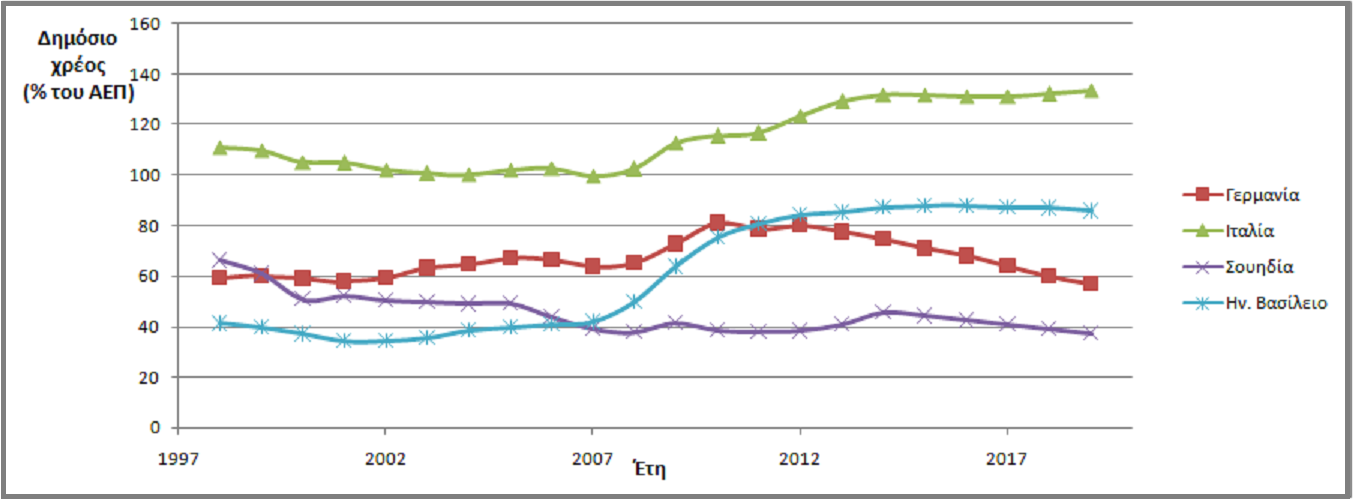 Διάγραμμα 2: Το δημόσιο χρέος (% του ΑΕΠ) ανά έτος για τις τέσσερις χώρες (1998-2019)