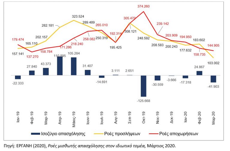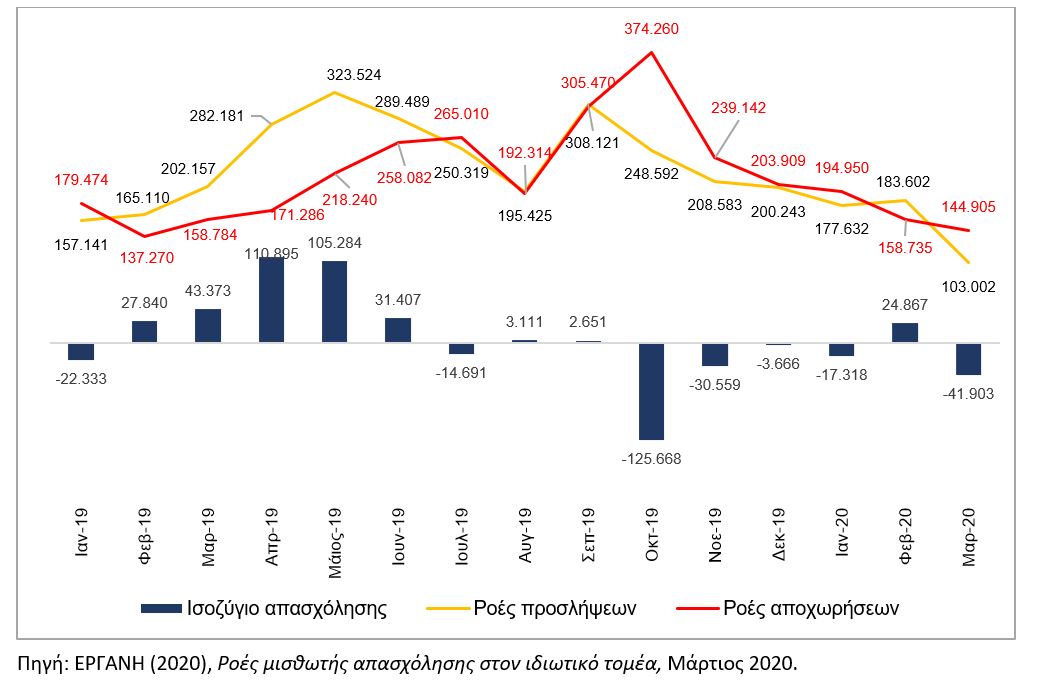 Ροές μισθωτής απασχόλησης στον ιδιωτικό τομέα (Ελλάδα, 1/2019-3/2020)