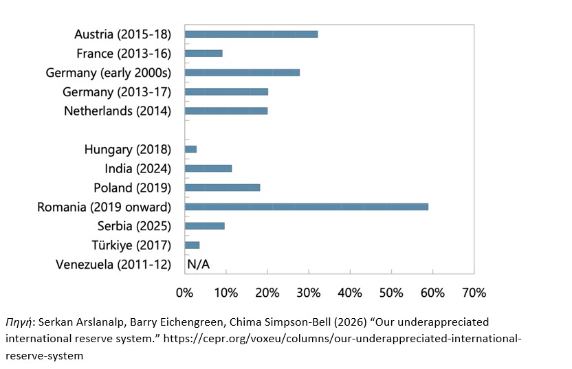 Επαναπατρισμός αποθεμάτων χρυσού από τις κεντρικές τράπεζες, 2000-2025 (% αποθεμάτων χρυσού στο τέλος του 2025)